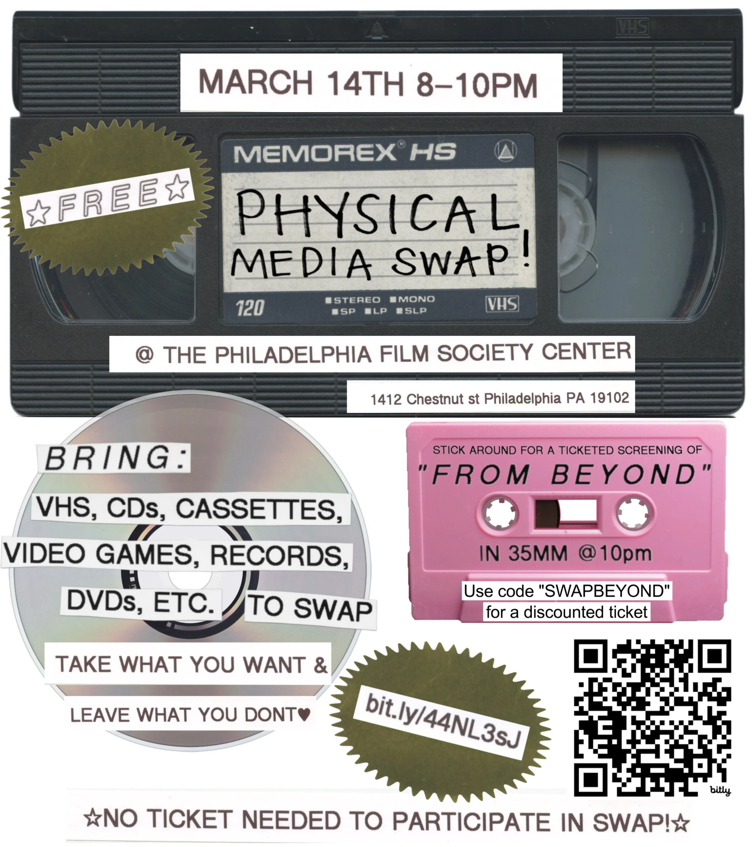 This is a swap!! we’ll bring the tables, you bring VHS, cassettes, CDs, video games, records, DVDs, etc to swap! take what you want and leave what you dont :) no money exchange